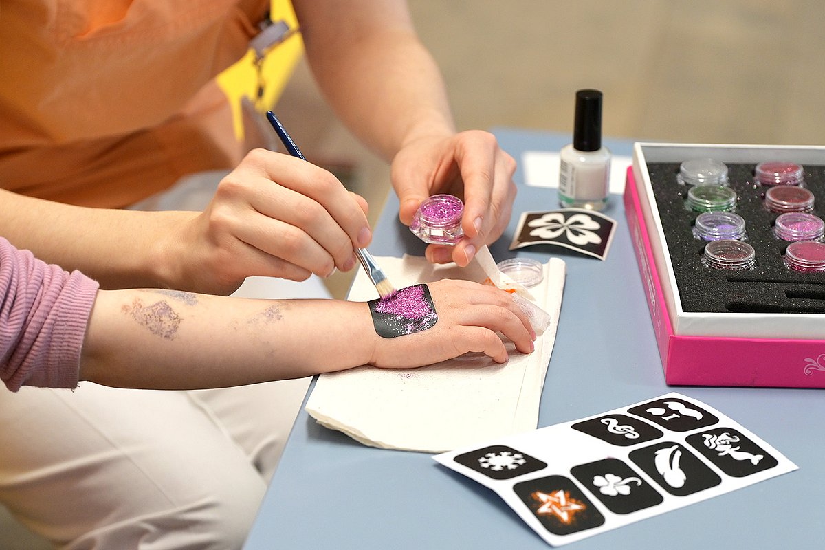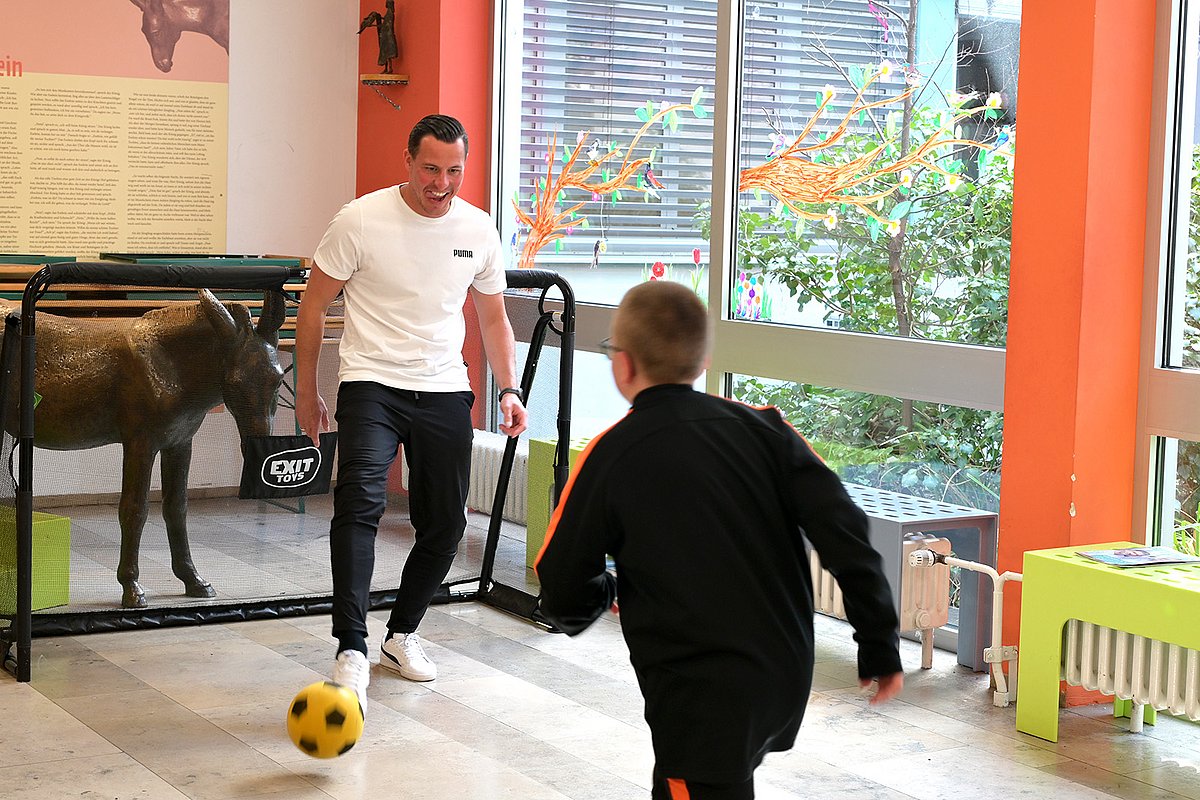 „Das war ganz klar Abseits!“, hallt es durch das Foyer der Kinder- und Jugendklinik des Uniklinikums Erlangen. „Auf keinen Fall!“, ruft ein junger Patient, lacht und schießt. Tor! Die SpVgg Greuther Fürth verwandelte die Eingangshalle der Erlanger Kinderklinik für einen Nachmittag in ein Fußballfeld, auf dem die jungen Patientinnen und Patienten toben konnten. Edgar Prib, Co-Trainer der Fürther U-19-Mannschaft, verteidigte das Tor und geriet dabei ordentlich ins Schwitzen. Neben Fußballspaß hatten die Kleeblätter auch Ostergeschenke im Gepäck und schminkten allen, die wollten, bunte Glitzertattoos.
