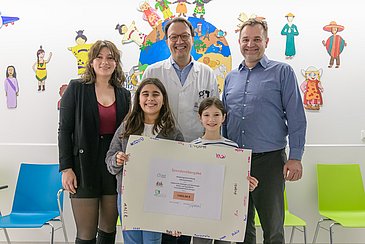 Die Kindergartenkinder im Alter von drei bis sechs Jahren und die Hortkinder im Alter von sechs bis zehn Jahren arbeiteten teils wochenlang mit viel Liebe zum Detail an ihren Kunstwerken. Auch die Organisation der Ausstellung im Garten der städtischen Einrichtung sowie die abschließende Auktion übernahmen die Mädchen und Jungen selbst. „Die Kinder haben das toll gemacht, so richtig mit Sektempfang und Gebotsschildern“, berichtet Kita-Leiterin Soultana Papadopulos und ergänzt schmunzelnd: „Dass die Kunstwerke in Zweierteams gestaltet wurden, hat uns bei der Auktion in die Hände gespielt. Die Eltern haben sich teils immer wieder überboten.“ Der Erlös soll Kindern zugutekommen, die es im Leben schwer haben, das stand von Anfang an fest. Über eine Mutter, die als Ärztin tätig ist, entstand der Kontakt zur Erlanger Kinderonkologie. „Mit eurer Spende können wir den Kindern und Jugendlichen im Krankenhaus Angebote für kreative Tätigkeiten machen – ich denke, das passt perfekt zu eurer Aktion“, bedankte sich Prof. Metzler bei Emma und Mina, die ihm den symbolischen Spendenscheck in Vertretung aller beteiligten Kinder überreichten.