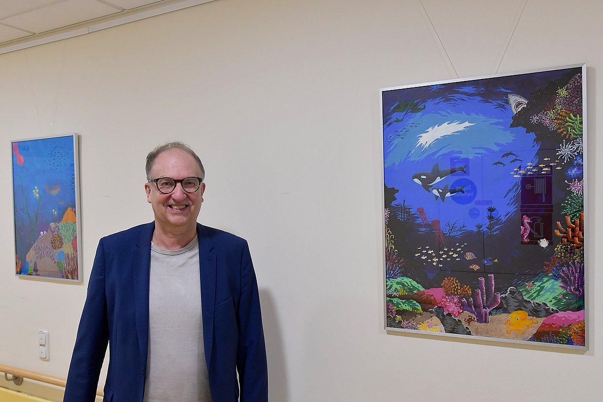 Mit Hilfe von vielfältigen, bunten Bildern Patientinnen und Patienten bestärken – das ist das Ziel der Ausstellung „Die Kraft der Kunst“ eines P-Seminars des Christian-Ernst-Gymnasiums Erlangen. Insgesamt zwölf aufmunternde Unterwasser-Bilder hängen nun im Foyer der Kinder- und Jugendklinik des Uniklinikums Erlangen. Prof. Dr. Joachim Wölfle, Direktor der Kinderklinik, eröffnete nun offiziell die Ausstellung im Beisein der jungen Künstlerinnen und Künstler, Lehrerinnen und Lehrer des Christian-Ernst-Gymnasiums sowie einiger Eltern. „Für unsere Patientinnen und Patienten kann das Uniklinikum Erlangen immer auch ein Ort der Ungewissheit sein, ein bisschen so wie die Unterwasserwelten auf den ersten Blick. Dann schaut man aber genauer hin und entdeckt die bunten Tiere oder Korallen, die etwas von dieser Ungewissheit und möglichen Ängsten nehmen“, sagte Prof. Wölfle bei der Eröffnung. Die Ausstellung kann noch bis zum Frühling besichtigt werden.