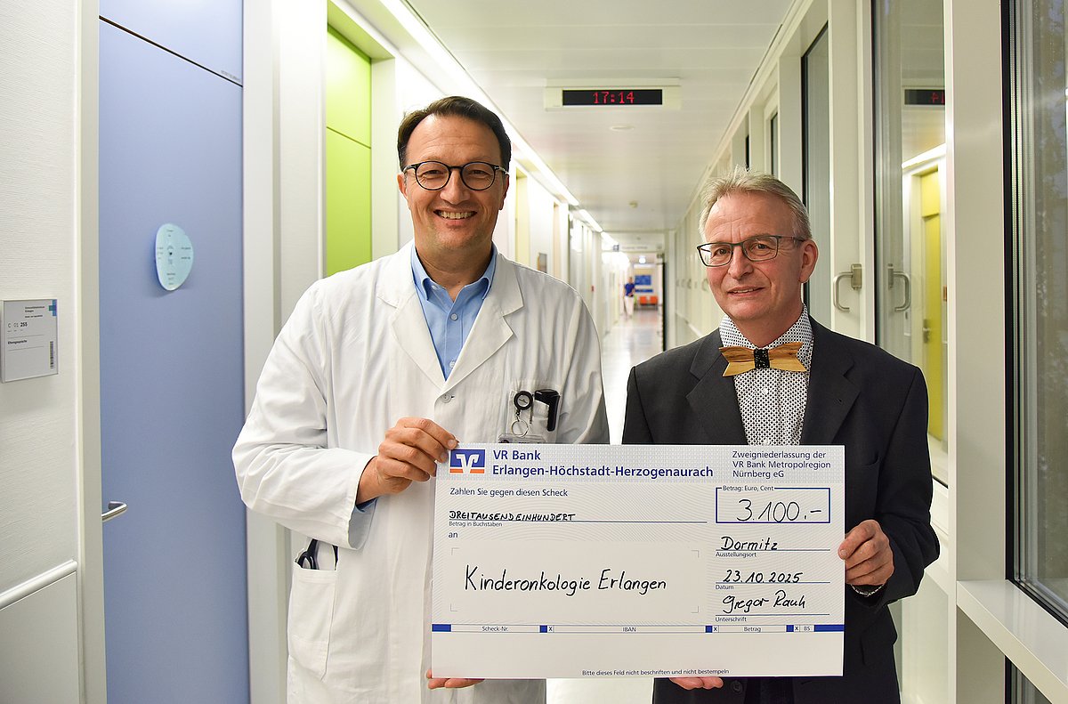 Auch nach Feierabend setzt sich Schreinermeister Gregor Rauh immer wieder an seine Werkbank, um schmucke Anzugfliegen aus Holz anzufertigen. Diese vertreibt er dann in seiner Dormitzer Werkstatt und über Auslagestellen in der Umgebung. Der einzige Zweck der Holzarbeiten ist es, den vollständigen Erlös aus ihrem Verkauf an das Kinderonkologische Zentrum (Sprecher: Prof. Dr. Markus Metzler) des Uniklinikums Erlangen zu spenden. Jetzt übergab der Schreinermeister zum wiederholten Mal einen großzügigen Spendenscheck an Prof. Dr. Markus Metzler, Leiter der Kinderonkologie – dieses Mal in Höhe von 3.100 Euro. „Das Geld fließt zu gleichen Teilen in unsere Ernährungs- und Sporttherapie für krebskranke Kinder und Jugendliche sowie in unsere Krebsforschung“, dankte der Kinderonkologe dem engagierten Holzkünstler.