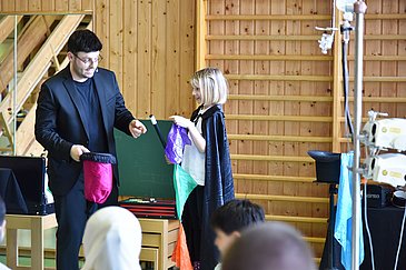 Ohne Berührungsängste bittet Sebastian Lehmeier auch einen Jungen samt seines Infusionsständers auf die kleine Zauberbühne und „repariert“ den verbundenen Arm erstmal mit einem überdimensionalen Schraubenschlüssel. Jetzt kann der Zauberstab geschwungen werden, und der kleine Zauberlehrling erlebt staunend, wie aus seiner Hand kleine weiche Bälle verschwinden oder sich gar verdoppeln. Und schon wieder geht etwas schief: Jetzt trauen sich alle im Turnsaal laut zu kichern, weil der Zauberer mit seiner Mini-Waschmaschine nicht zurechtkommt. Obwohl ihm Kinder mit unsichtbarem Waschmittel helfen, will das Zaubertuch einfach nicht weiß werden. Stattdessen spuckt die Waschmaschine Seifenblasen oder sogar kleine künstliche Flammen aus. Die eigenwillige Waschmaschine hat Sebastian Lehmeier diesmal als Überraschung dabei. Da er dank der Finanzierung durch Herzpflaster e. V. seine Zaubershow heuer noch dreimal in der Erlanger Kinderklinik zeigen wird, ist sein Programm nie völlig gleich. Denn: zahlreiche Kinder und Jugendliche sowie ihre begleitenden Eltern verbringen hier viele Wochen oder gar Monate. Der Förderverein Herzpflaster e. V. schenkt deshalb bewusst Augenblicke der Freude, um gerade längere Klinikaufenthalte möglichst kurzweilig zu gestalten.