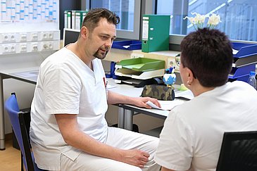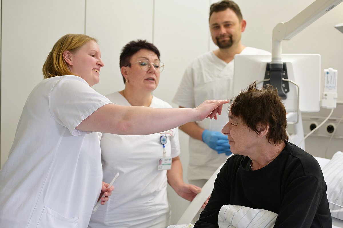 Die Patientinnen und Patienten der Neurochirurgie weisen Erkrankungen oder Verletzungen an Gehirn, Rücken bzw. Rückenmark oder Nerven auf. Das reicht vom Bandscheibenvorfall über Schädel-Hirn-Traumata bis hin zu Hirnaneurysmen und -tumoren. Sie haben Operationen am Kopf oder an der Wirbelsäule vor oder hinter sich und sind deshalb häufig nervös oder ängstlich. „Ein bösartiger Hirntumor, der entfernt werden muss – das ist natürlich furchteinflößend. Es ist also unsere Aufgabe als Pflegende, ihnen zuzuhören, behutsam zu kommunizieren und sie bestmöglich da hindurch zu begleiten“, erläutert Olga Oliger. „Patientinnen und Patienten, aber auch Angehörige im Pflegeprozess mitzunehmen, ist ein wichtiges Ziel der Ausbildung.“ Neben Einfühlungsvermögen brauche es – gerade in der Neurochirurgie – aber auch eine gute Beobachtungsgabe und eine aufmerksame Wahrnehmung, was Befinden, Verhalten, Stimmung und Wesen der Patientinnen und Patienten betrifft. „Denn ihr neurologischer Zustand kann sich manchmal schnell verändern. Hier müssen auch unsere Auszubildenden sehr wachsam sein“, erklärt die Stationsleitung.